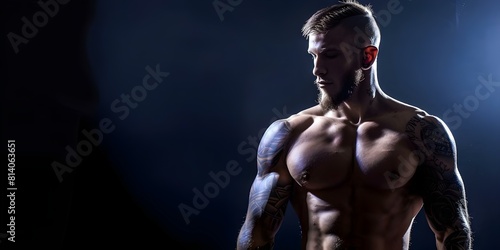 © Anastasiia, Fototapeta premium Photo of muscular man in tattoo studio against black background. Concept Muscular man, Tattoo Studio, Black Background, Portrait Photography