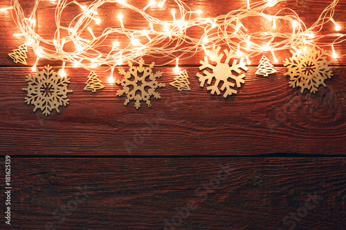 Obraz premium Photo of New Year's wooden red background with burning garland from above, snowflakes