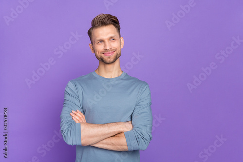 Obraz premium Photo of nice brown hairdo guy crossed arms look promo wear trend cloth isolated on violet color background