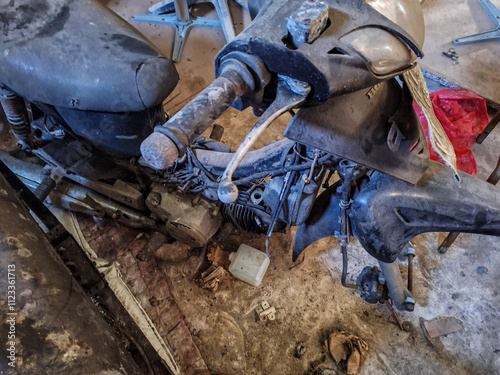 © Putradigitalid, Obraz premium Photo of old and broken motorcycle in garage. Selective focus.