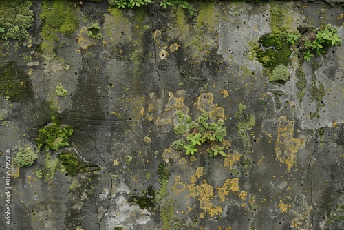 © Larysa, Obraz premium Photo of Old dirty gritty mossed concrete wall. Background texture for backdrops or mapping