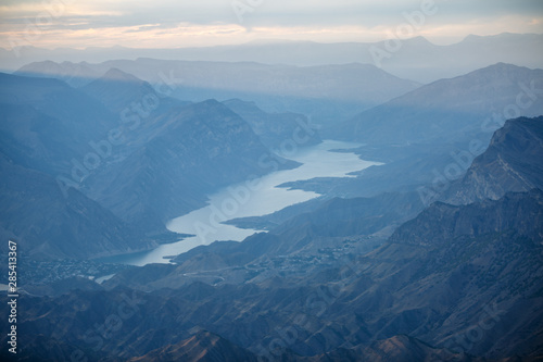 © Sergey Mironov, Fototapeta premium Photo of picturesque mountain landscape, river, foggy sky in summer