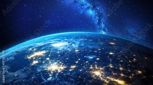 © Johannes, Obraz premium Photo of Planet Earth and its Satellites at night from space - North America connected to the rest of the world, technology, global community and futuristic communication system concept.
