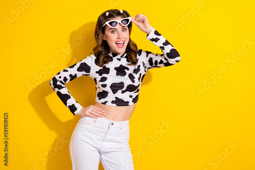 © deagreez, Fototapeta premium Photo of positive girl wear sunglass impressed trip discounts wear black spot outfit isolated shine color background