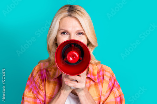 Obraz premium Photo of positive person with blond hair dressed checkered shirt announcing sale in red megaphone isolated on teal color background