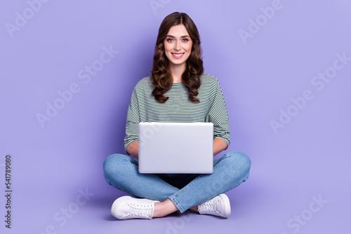 © deagreez, Naklejka premium Photo of pretty positive lady sitting floor enjoy using modern quality device gadget sale isolated on purple color background