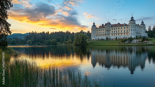 © Dzikrul Husnani, Fototapeta premium Photo of Prince Ch gradient blue sky with the reflection on water surface at sunset, distant view set in front and right side is rugged majestic grand building that looks like an mosque located near