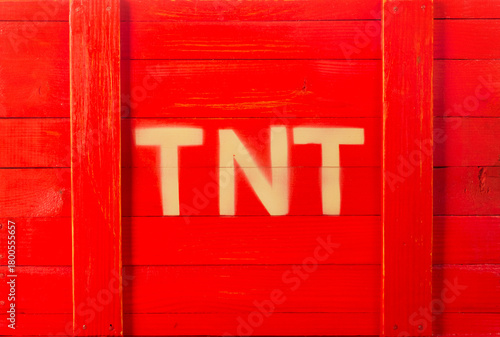 © breakermaximus, Naklejka premium Photo of red painted wooden dynamite box panel with tnt insignia.