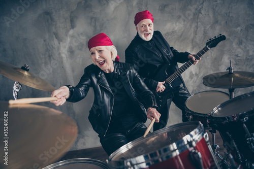 © deagreez, Fototapeta premium Photo of retired lady man rock popular band one team years perform concert play drum instruments solo guitar family wear trendy rocker leather outfit isolated grey concrete wall background