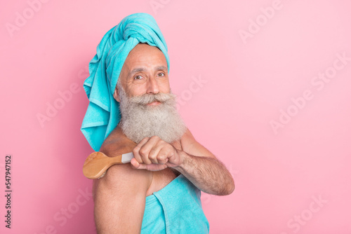 Obraz premium Photo of retired man rejuvenating use massager brush on hand have spa center procedure isolated pastel color background