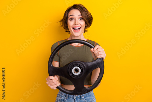 © deagreez, Fototapeta premium Photo of satisfied impressed nice girl dressed khaki t-shirt holding steering wheel buy new car isolated on yellow color background