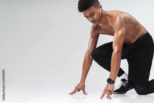 Obraz premium Photo of shirtless african american man using earpod while working out