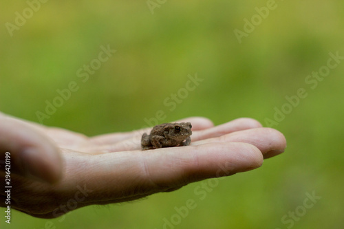 Obraz premium Photo of small green frog sitting on a hand. Young frog on a palm. Little...