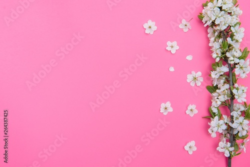 Fototapeta premium photo of spring white cherry blossom tree on pink background. View from above, flat lay, copy space. Spring and summer background.