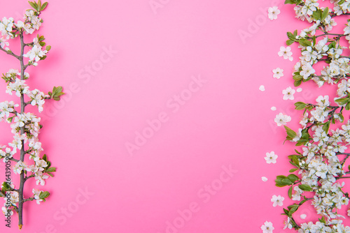 Fototapeta premium photo of spring white cherry blossom tree on pink background. View from above, flat lay, copy space. Spring and summer background.
