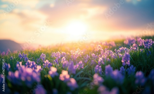 Fototapeta premium Photo of Stokksnes with vast Icelandic mountains and sea, purple hyacinth flowers in the foreground, sunlight rays on blue sky, green meadows near river bank, landscape photography