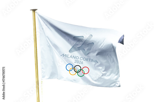 © Delphotostock, Fototapeta premium Photo of the logo of the 2026 winter olympics Milano Cortina on a flag on a pole isolated on white or transparent background, png cut out