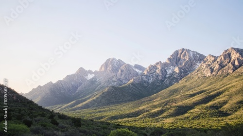 Fototapeta premium photo of the majestic beauty of a towering mountain range, with rugged peaks covered in snow, lush green valleys below, and a clear blue sky, creating a breathtaking natural landscape