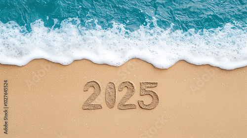 © Kookkii, Fototapeta premium Photo of the number 2025 written in sand on a tropical beach with the ocean waves approaching