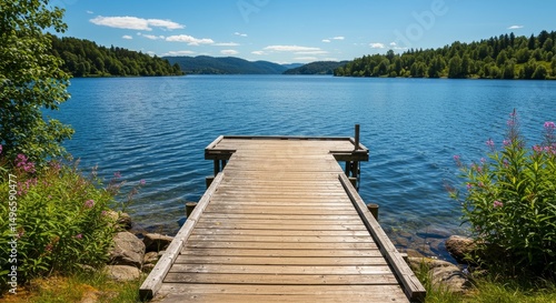 Naklejka premium Photo of Tranquil Wooden Dock on Lake with Blue Sky