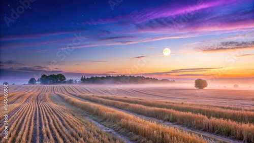 © AnjumanAra, Fototapeta premium Photo of vast harvested field stretching towards the horizon under a breathtaking dawn sky painted with vibrant purple and orange hues, with gentle mist blanketing the landscape