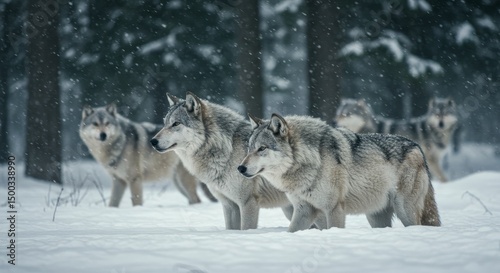 © Cahyani, Fototapeta premium Photo of Wolves in Snowy Winter Forest Majestic Wildlife Nature Scene