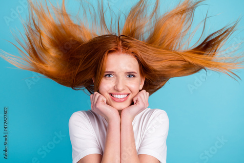 © deagreez, Fototapeta premium Photo of young girl happy positive smile hands touch chin wind blow ginger hair enjoy new conditioner isolated over blue color background
