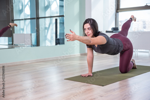 Fototapeta premium Photo of young woman practicing yoga indoor. Beautiful girl practice yoga in class. Yoga studio instructor. Blurred background.