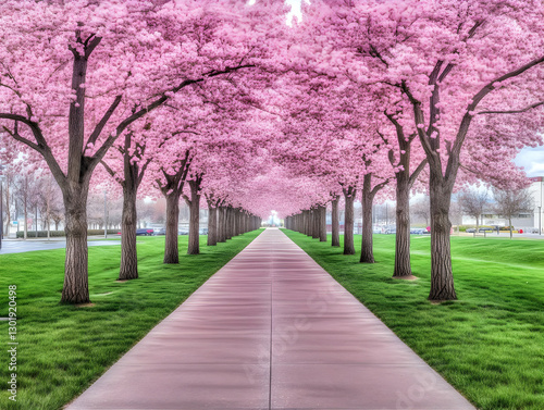 Naklejka premium Photo Pink Trees Pathway Spring Blossoms Nature Landscape Scenic