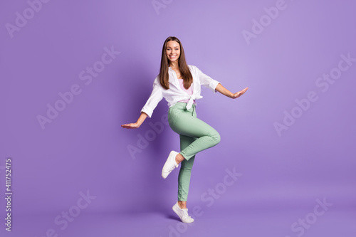 Obraz premium Photo portrait full body view of cute girl standing on one leg isolated on vivid purple colored background