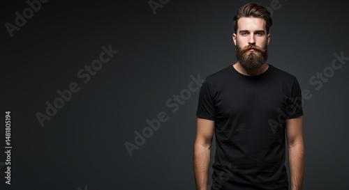 © Siasart Stock, Fototapeta premium Photo Portrait of a Bearded Man in Black T-Shirt on Dark Background