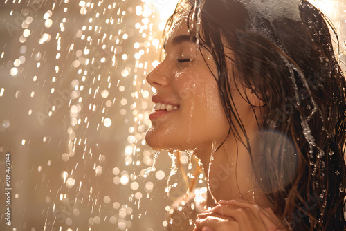 © Oksana_Latysheva, Obraz premium Photo portrait of a beautiful smiling woman taking a shower