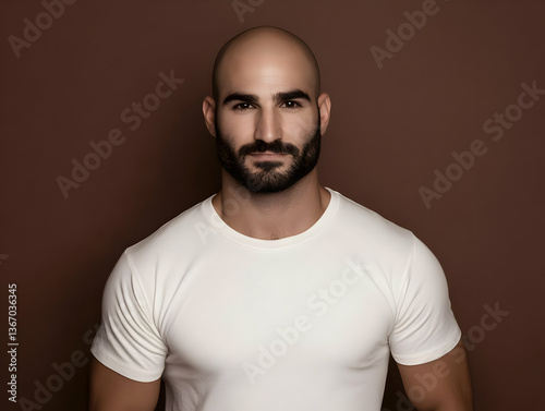© Harry, Naklejka premium Photo Portrait of a Confident Bald Man with Beard in White T-Shirt