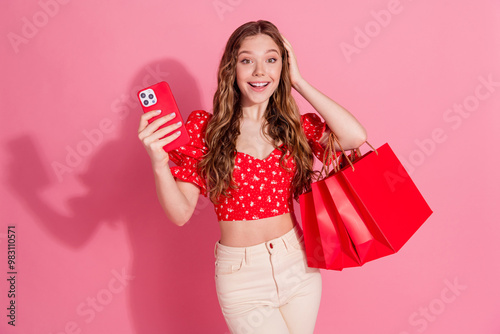 © deagreez, Fototapeta premium Photo portrait of attractive teen woman hold gadget excited shopping bags dressed stylish red clothes isolated on pink color background