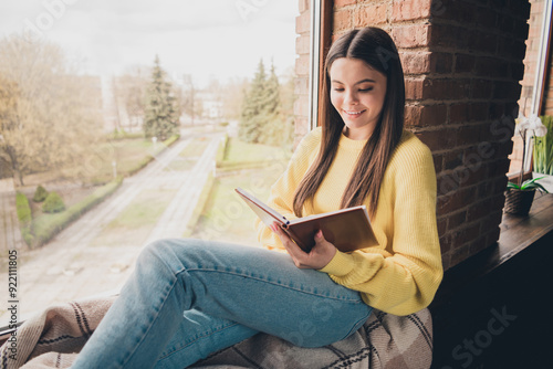 Obraz premium Photo portrait of attractive teen woman read book sit windowsill dressed yellow outfit cozy day light home interior living room
