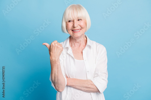 Fototapeta premium Photo portrait of grandmother with blonde hair showing looking at blank space smiling wearing white outfit isolated on vivid blue color background