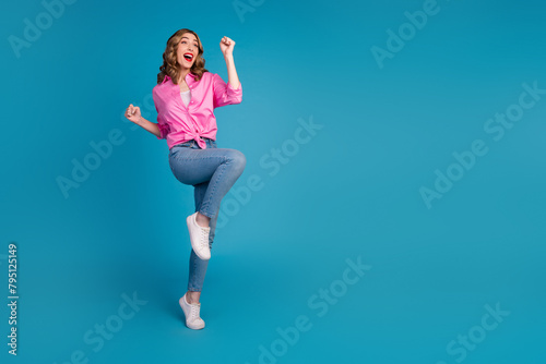 © deagreez, Obraz premium Photo portrait of lovely young lady raise fists winning dressed stylish pink garment hairdo isolated on blue color background