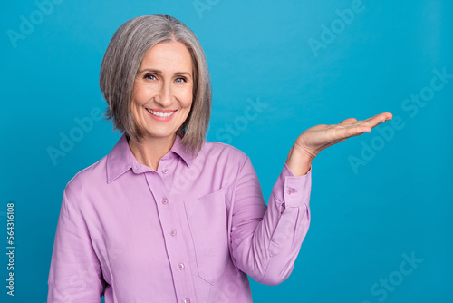 Fototapeta premium Photo portrait of positive satisfied old business woman wear purple formal shirt hold arm demonstrate object promo isolated on blue color background