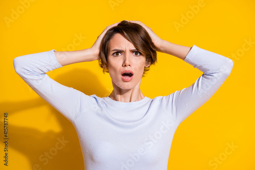 Fototapeta premium Photo portrait of unhappy woman in panic touching head isolated on bright...