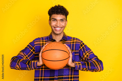 Fototapeta premium Photo portrait of young man keeping basket ball smiling in casual clothes isolated vivid yellow color background