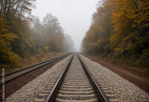 Fototapeta premium Photo Railway tracks disappear in an autumnal, misty landscape