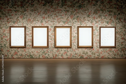 © ARTenyo, Fototapeta premium Photo-realistic image featuring empty canvases displayed in oak frames, set against a whimsical floral wallpaper background