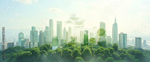 © Netaya, Obraz premium Photo realistic top view of a cityscape blended with environmental icons symbolizing green urban development, eco-friendly infrastructure, and ample copy space.