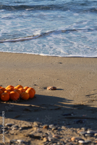 © Broker_Aleksandr, Obraz premium photo shoot with Basket oranges beach. High quality photo