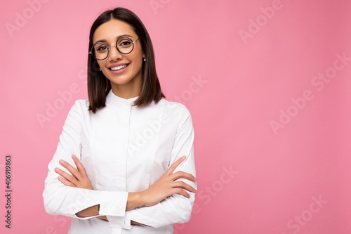 © Ivan Traimak, Fototapeta premium Photo shot of beautiful smiling young brunette woman wearing casual clothes and stylish optical glasses isolated over colorful background looking at camera