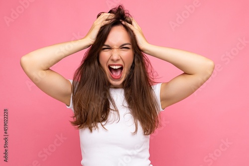 © Ivan Traimak, Fototapeta premium Photo shot of cute nice charming gorgeous attractive pretty youngster happy and crazy woman wearing white t-shirt for mockup isolated over colorful background with copy space