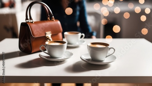 Fototapeta premium photo showing two coffee cups and a woman's handbag placed on a white table