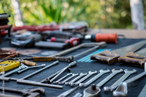 Fototapeta premium Photo top view a huge set collection of working hand and power tools many for...