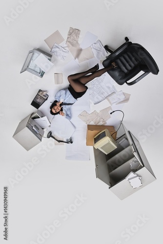 © Lustre Art Group , Naklejka premium Photo upside down. Young businesswoman lying on office floor talking on phone surrounded by scattered documents and messy furniture. Concept of office lifestyle, human emotions, business