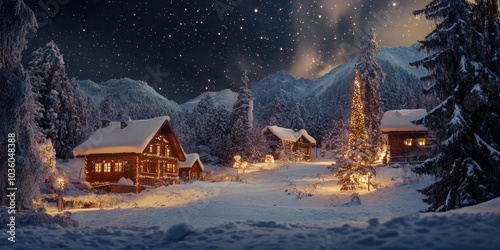 Fototapeta premium photo Winter village covered in snow, twinkling lights, starry sky